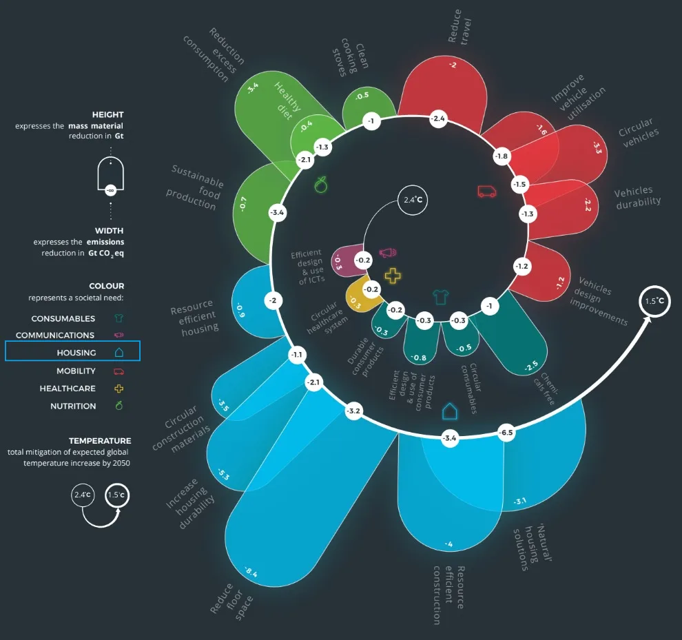 In numeri, questi interventi potrebbero ridurre del 28% l’estrazione e l’utilizzo delle risorse naturali, diminuendo quindi del 39% le emissioni, e portare il nostro pianeta a un livello più accettabile di riscaldamento globale, attestandosi su + 1,5 °C rispetto all’era preindustriale (ora siamo a + 2,4°C!).